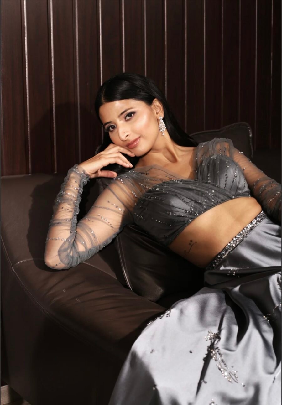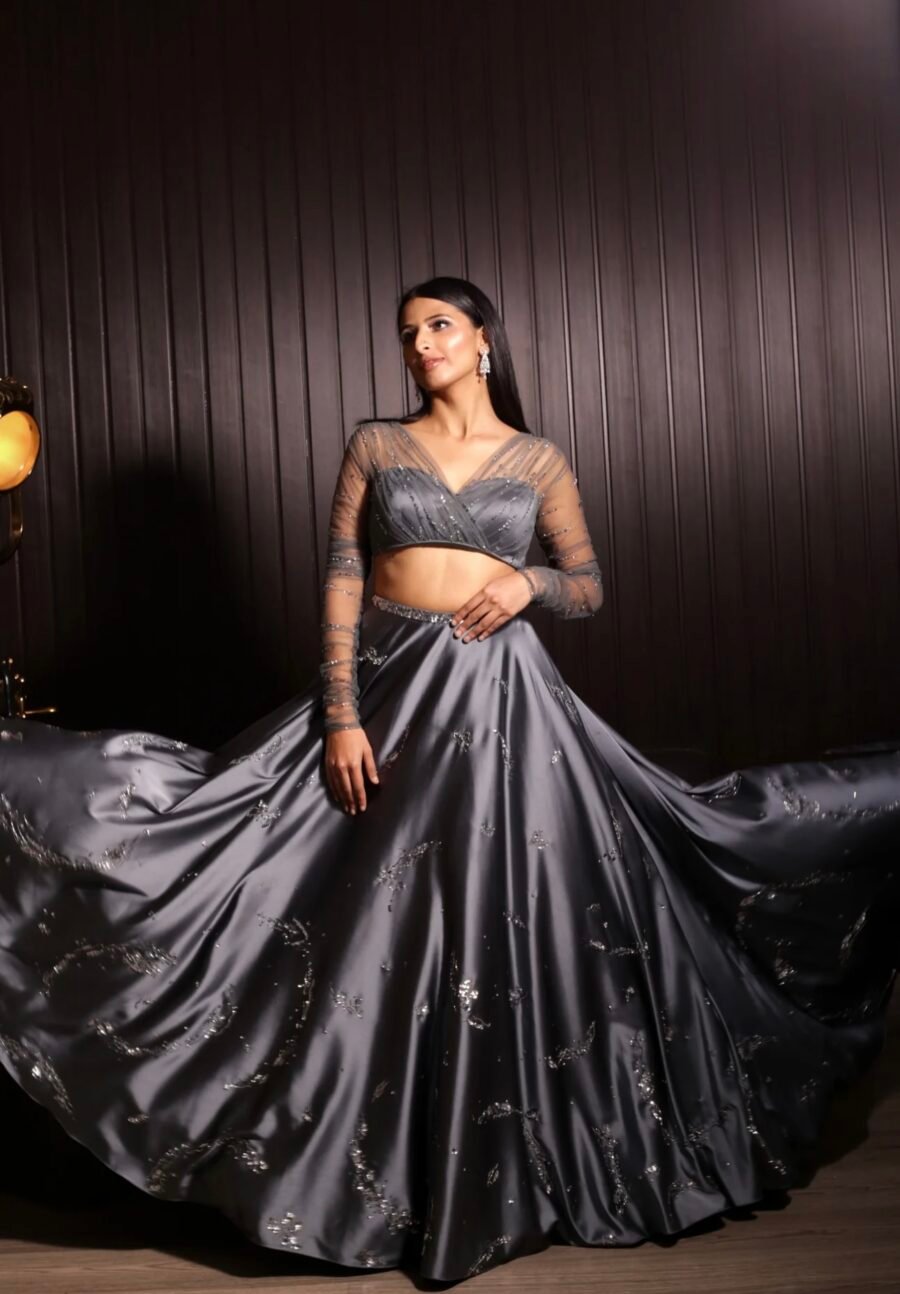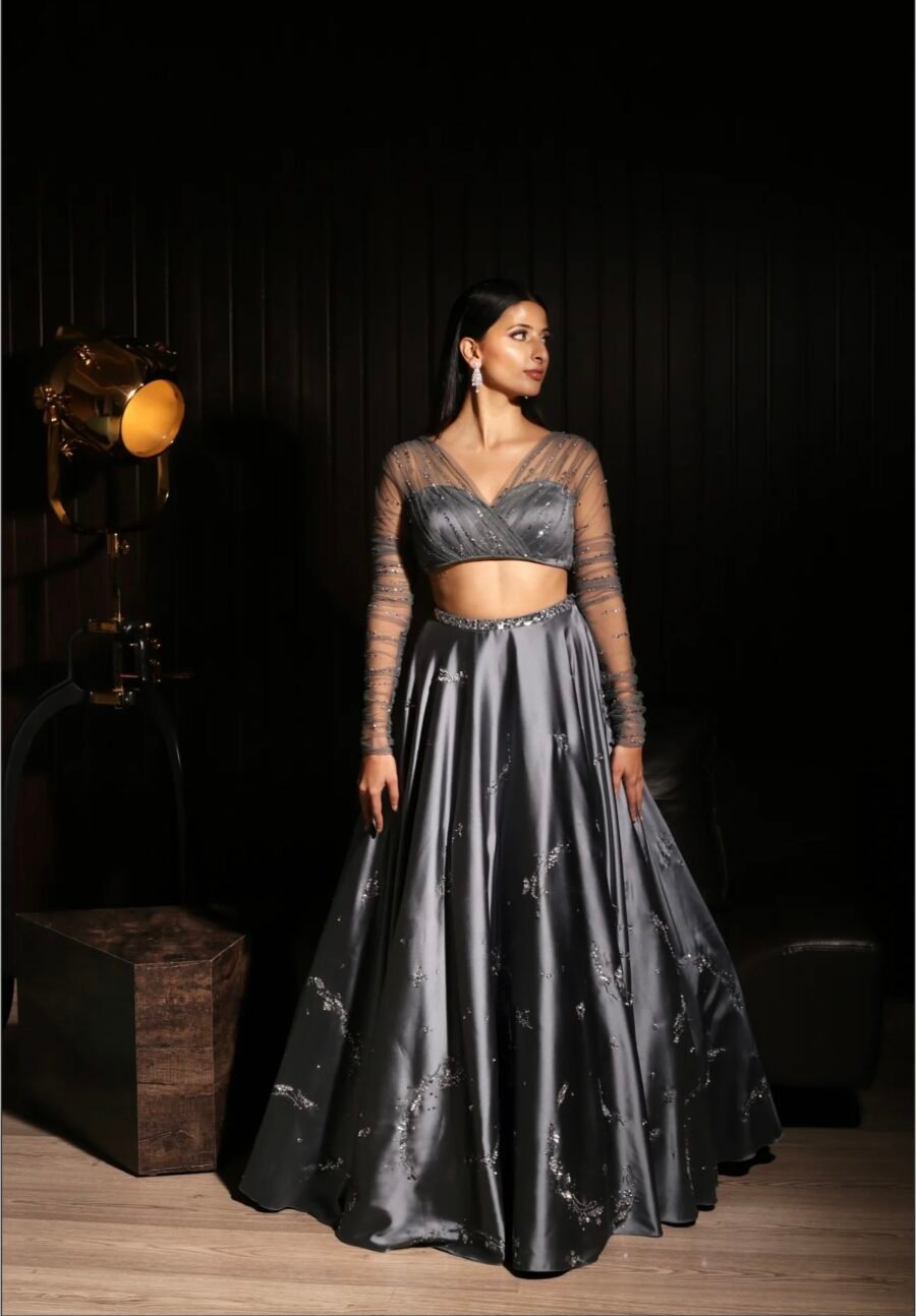 This glamorous grey lehenga set is perfect for Sangeet and Cocktail wedding events owing to its luxurious fabric and grand silhouette. It is hand embroidered with shimmering crystals, sequin and beads in an abstract design and comprises of a beautiful sheer draped embroidered blouse and a wide flared can-can under layered lehenga.