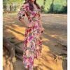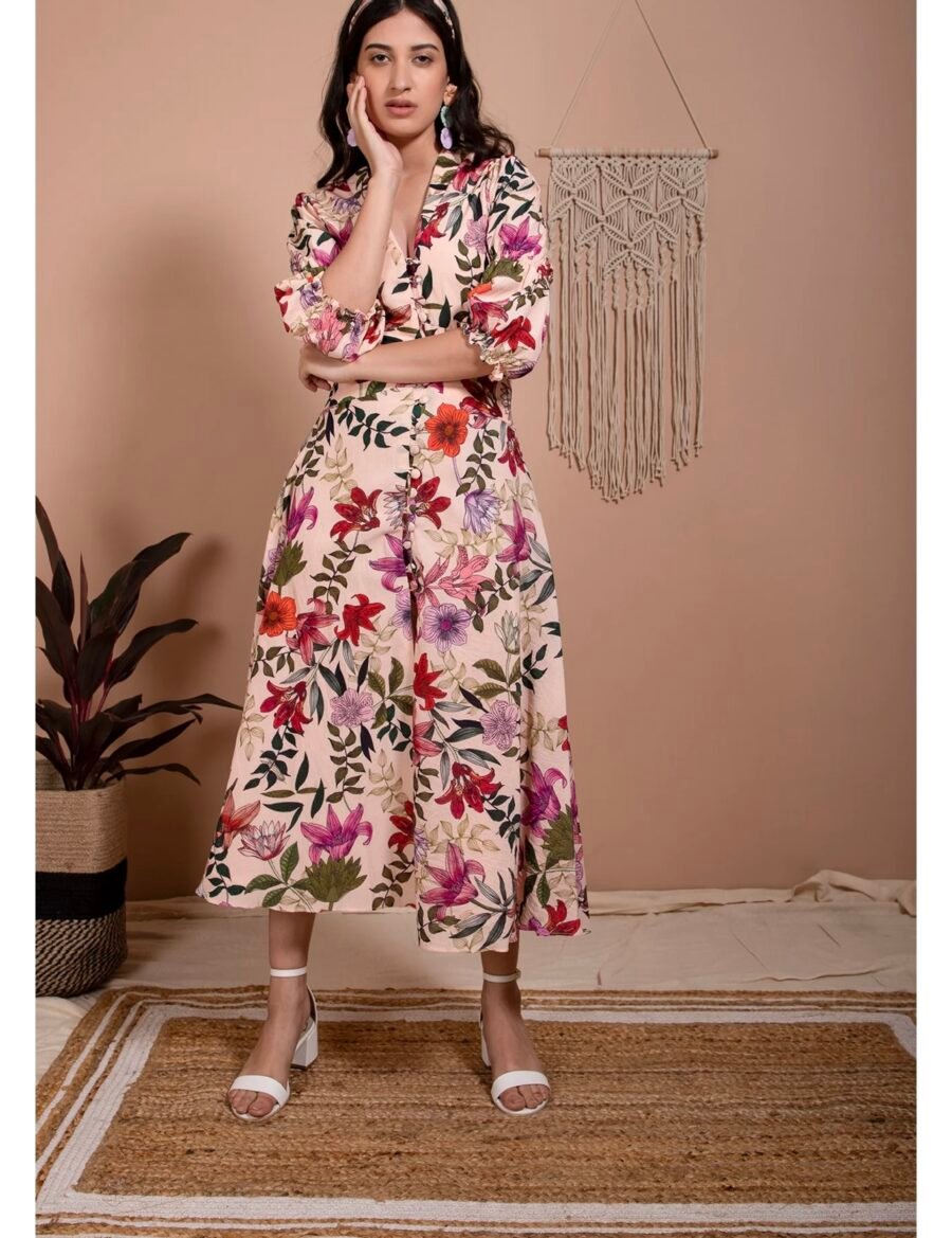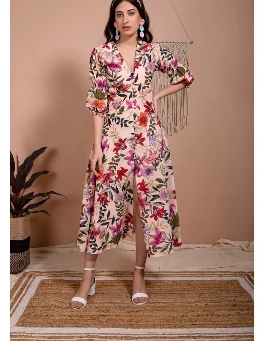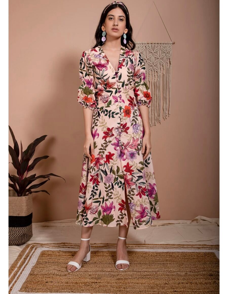 Double puffed sleeves, V-neck dress, fitted to the waist, flared down, crafted in our soya protein fabric in our petunia print.