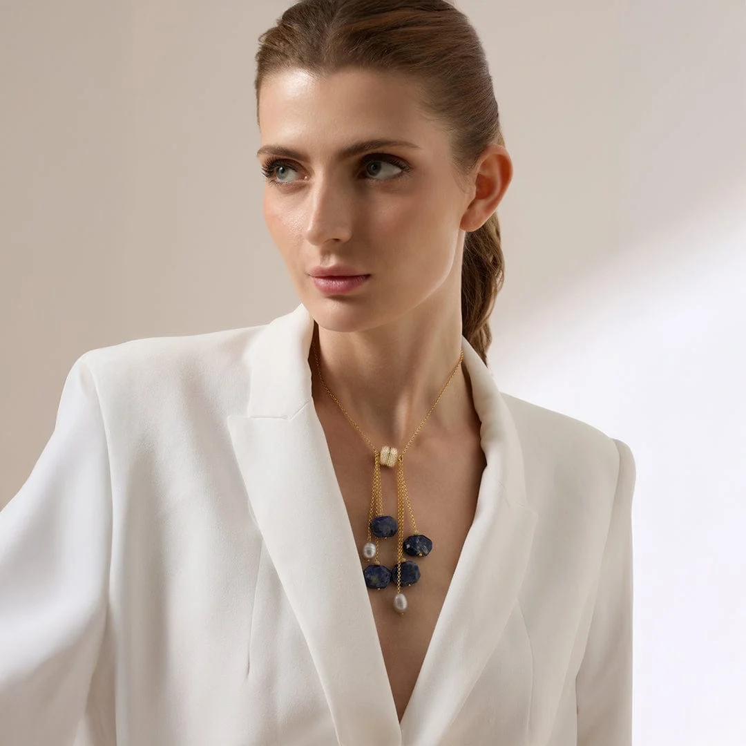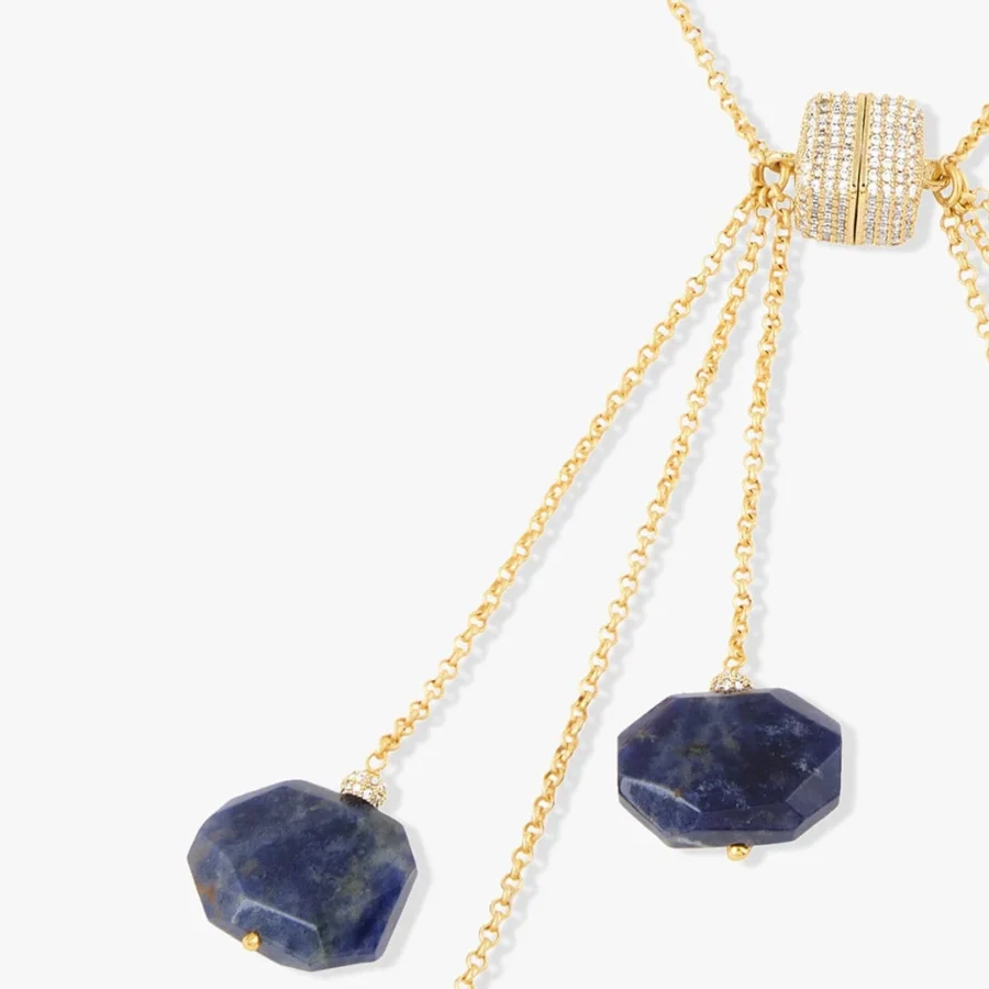 The Avenari Necklace is inspired by deep rivers under starlight. It features polished blue agate stones strung on a sleek gold-toned chain, with a graceful drop detail that moves as you do. Secured with a magnetic clasp, this piece adds quiet strength to any outfit. Each agate is naturally varied in hue and form, offering a rich, fluid rhythm unique to your necklace.