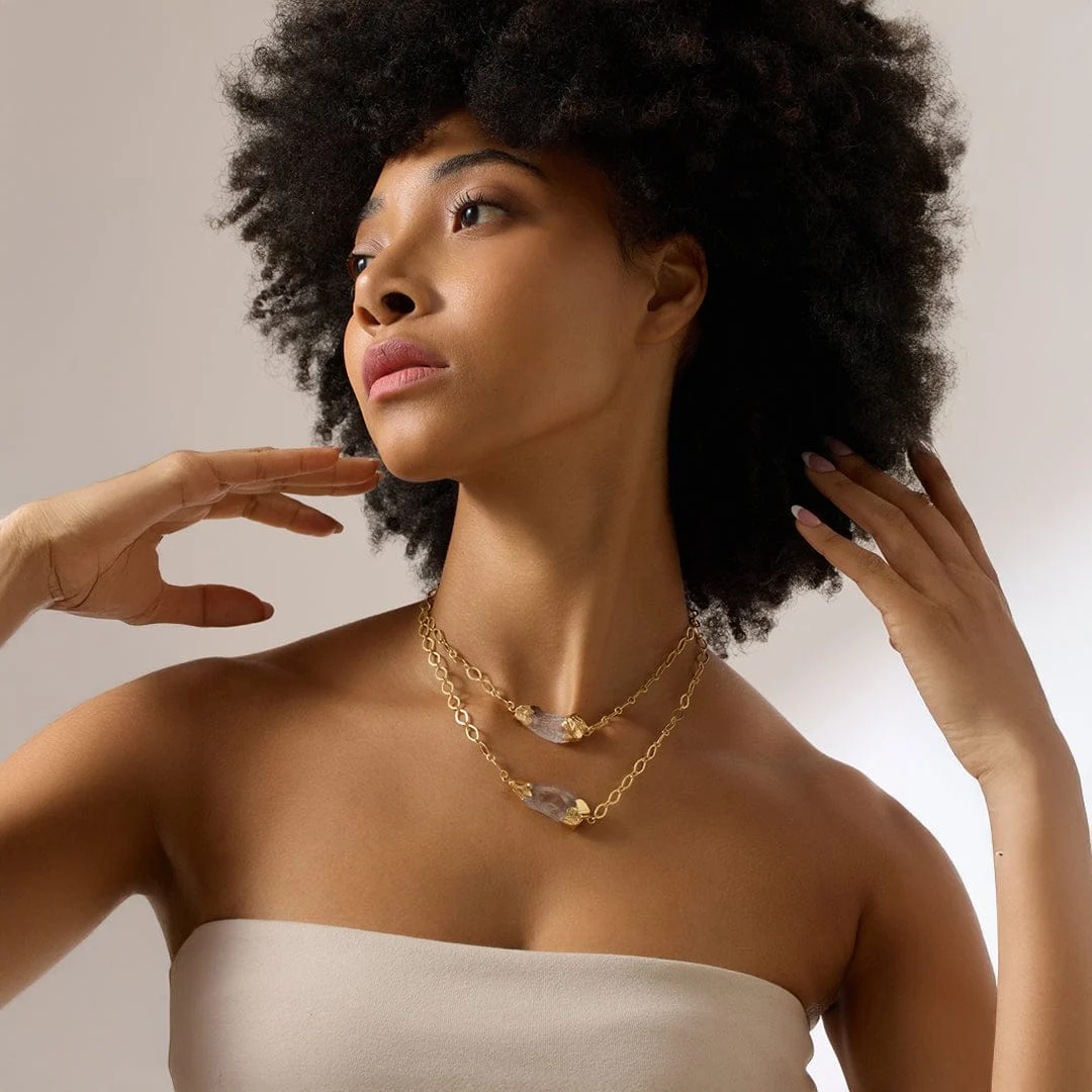 The Avenza Necklace channels the energy of golden light cast across stone. It features faceted gold quartz stones arranged in a rhythmic sequence along a sleek chain. Secured with a lobster clasp, this necklace adds a balanced shine to both minimal and layered styling. The quartz stones vary naturally in tone and shape, creating soft movement and quiet individuality.