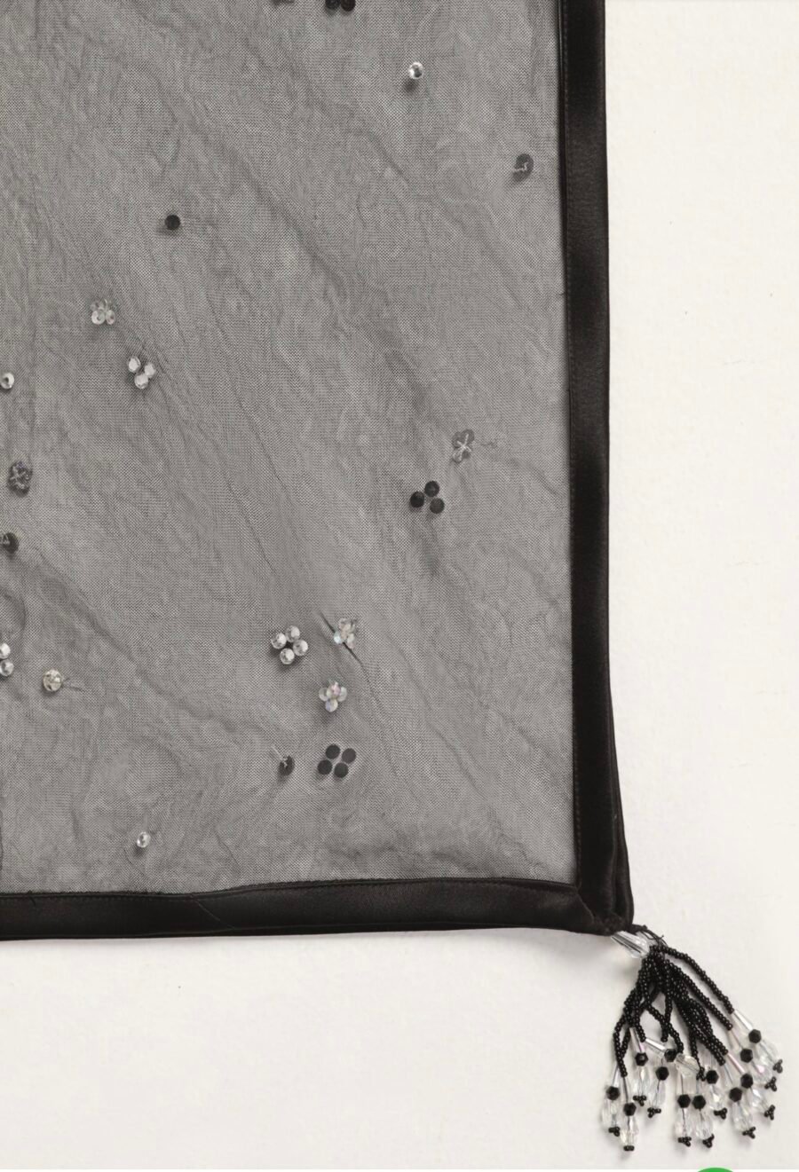 Striking black satin lehenga set hand embroidered with crystals and sequin in a floral and abstract design. The blouse of this stunning set has been draped meticulously, the can-can under layered skirt has a wide ‘perfect for twirling in’ flare and the full sized hand embroidered shimmering dupatta is complete with hand crafted tassels.