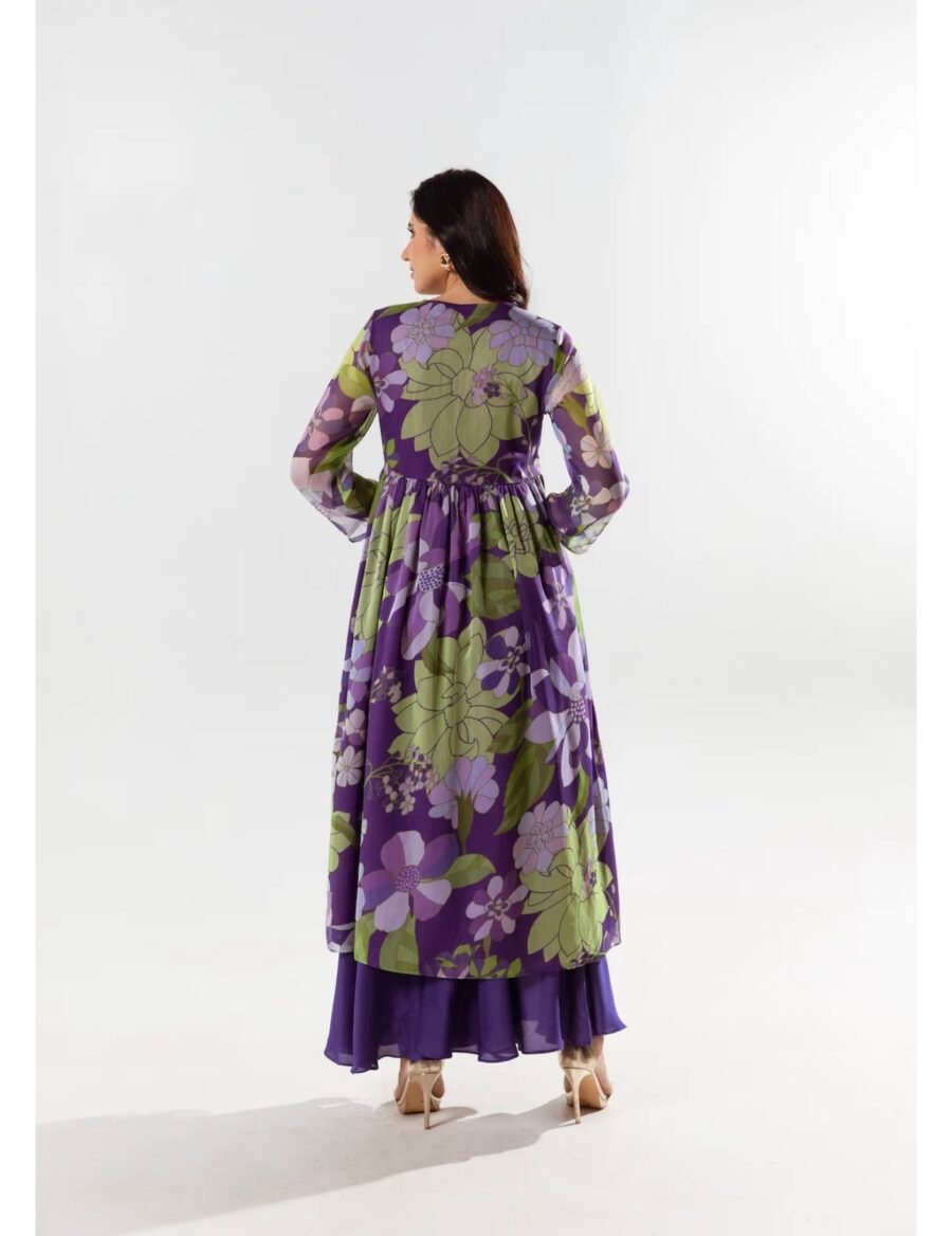 Embellished V-Neck, long kurta paired with solid flared pants. Handcrafted in our sustainable chiffon fabric in Ibris print.