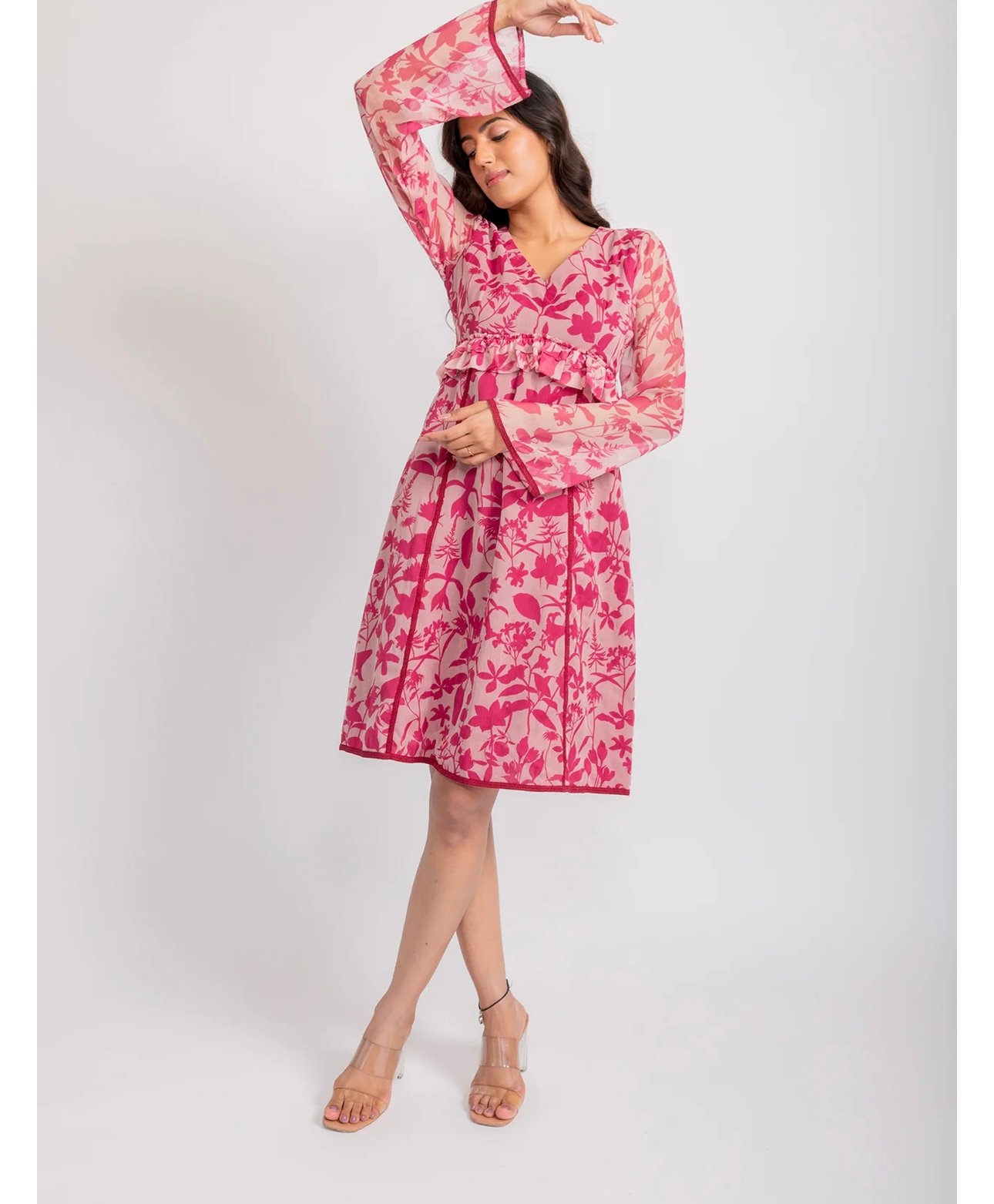 Knee length V-neck, comfort-fit flared dress, with lace panels and ruffle details on the waist. Handcrafted in recycled chiffon fabric in India by our talented artisans.