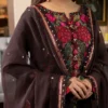 Echoes of vintage tales whisper through this dark brown masterpiece. Every thread – be it pink, maroon, or deep beige – sketches a floral fantasy, set alight by matte gold sequins. The accompanying dupatta, a promise of timeless allure. Immerse yourself in the timeless artistry of ‘aari stitch’ with this design and let the intricate craftsmanship adorn your style.