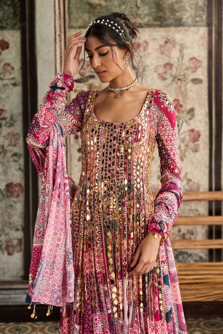 Fuschia Print And Highlighted Anarkali With Printed And Highlighted Dupatta