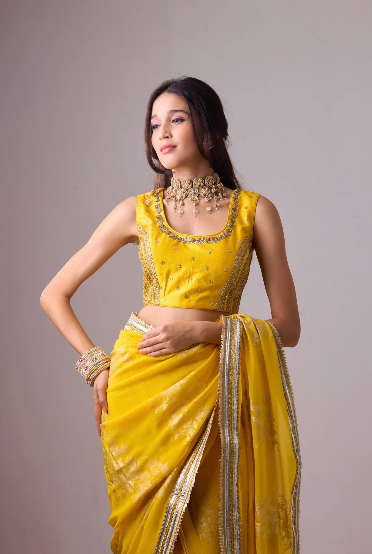 Haldi Phool georgette badal sitara gold foil printed saree with heavy hand embroidery and gota work pure raw silk blouse and handmade latkans.