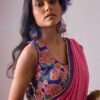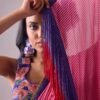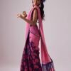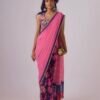 Georgette violet and pink striped and rose printed saree highlighted with handwork and ombre and gold fringes detailing at saree border paired with heavy full embroidered modal satin rose printed blouse with beautiful handcrafted floral tassels hangings at the back.