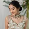 Showcasing a fusion of hand block-printed patterns, the Gulbahaar Chanderi Silk Saree is an intricately made printed Chanderi saree with an extravagant pallu finished with beautiful matte gold kiran. One can pick our customised blouse finished with handcrafted matte gold gota tassel hangings or our regular blouse piece of the same fabric.
