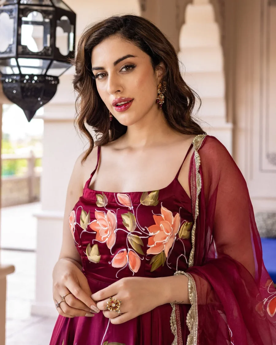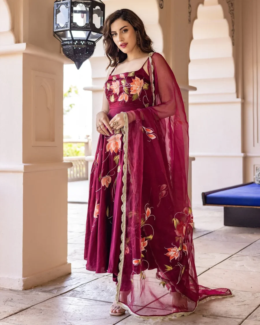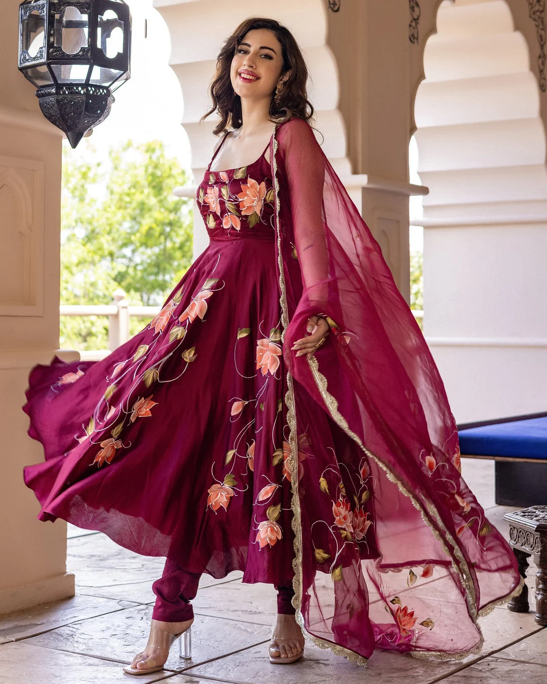 The Grouna Handpainted Suit Set is exclusively made in the hottest colour of the season- the red wine hues of magic; thus, making this outfit a perfect one to be adorned at all get-togethers and soirees.