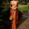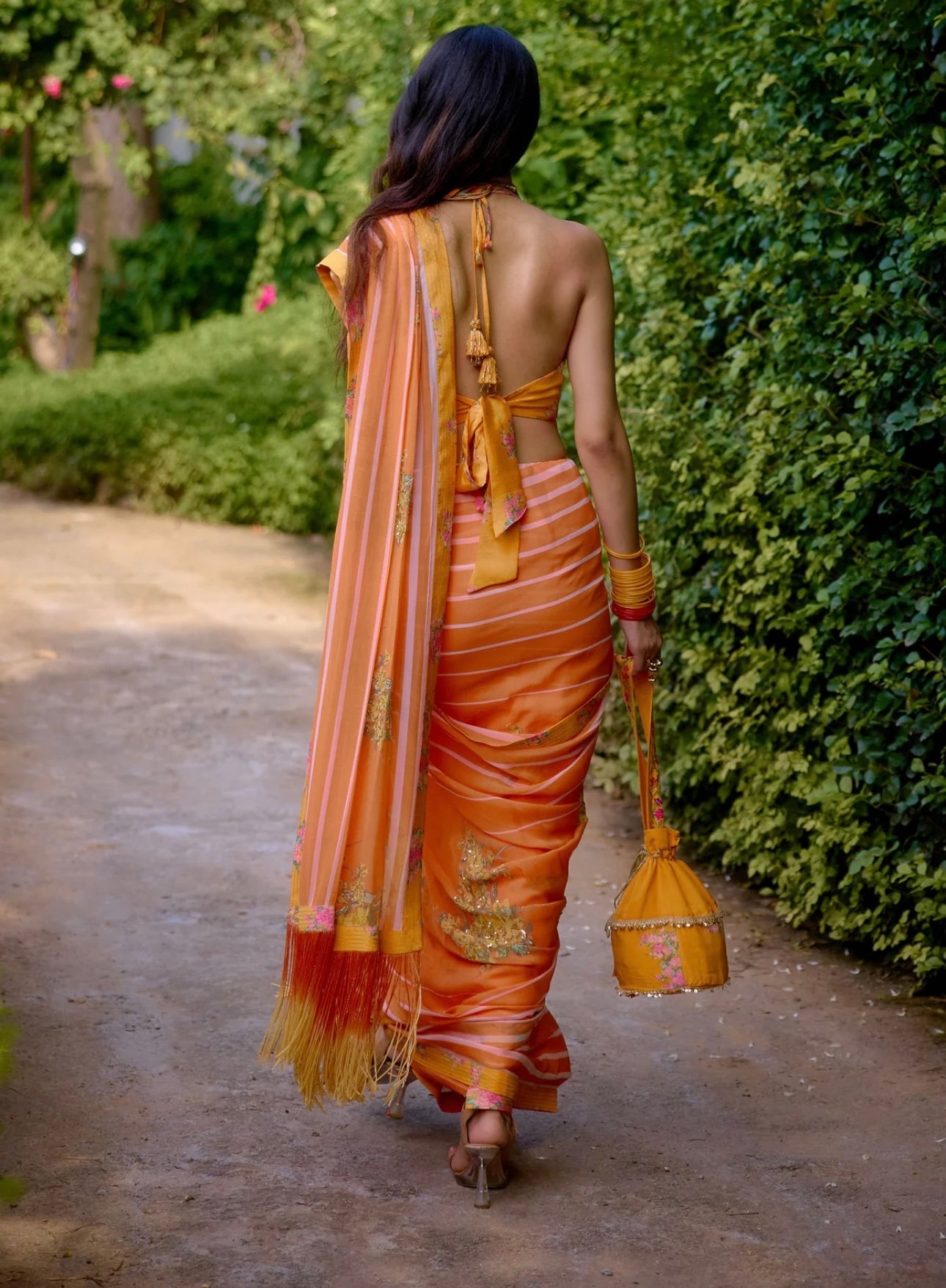 Peach orange georgette Badal Bibi printed heavy embroidered saree paired with halter printed embroidered blouse.