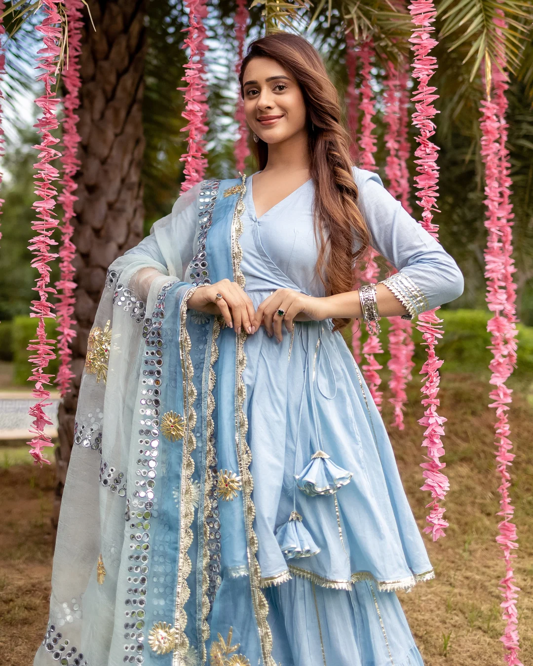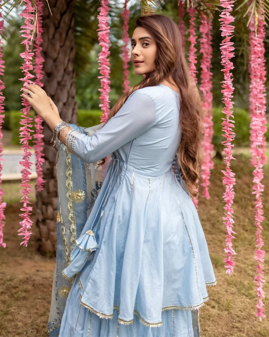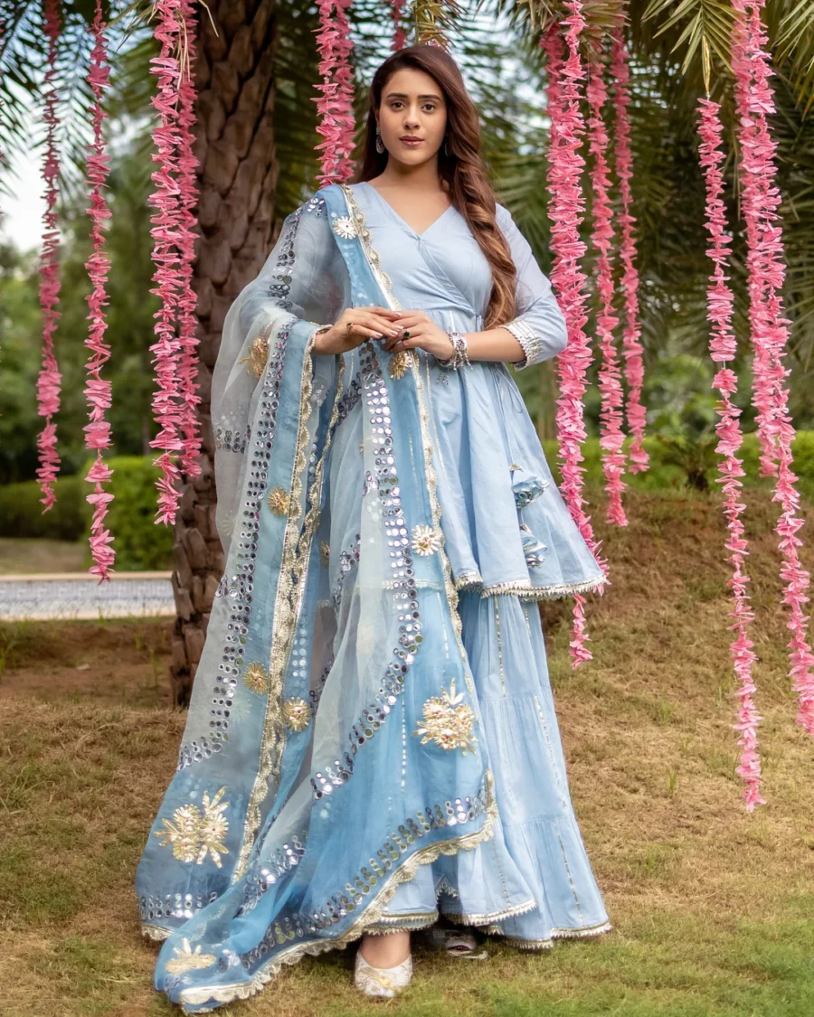Wear this beauty to your next special occasion. Our Kassia Gotapatti Sharara Set comes with angrakha styled kurta, tiered sharara and heavy gotawork organza dupatta.