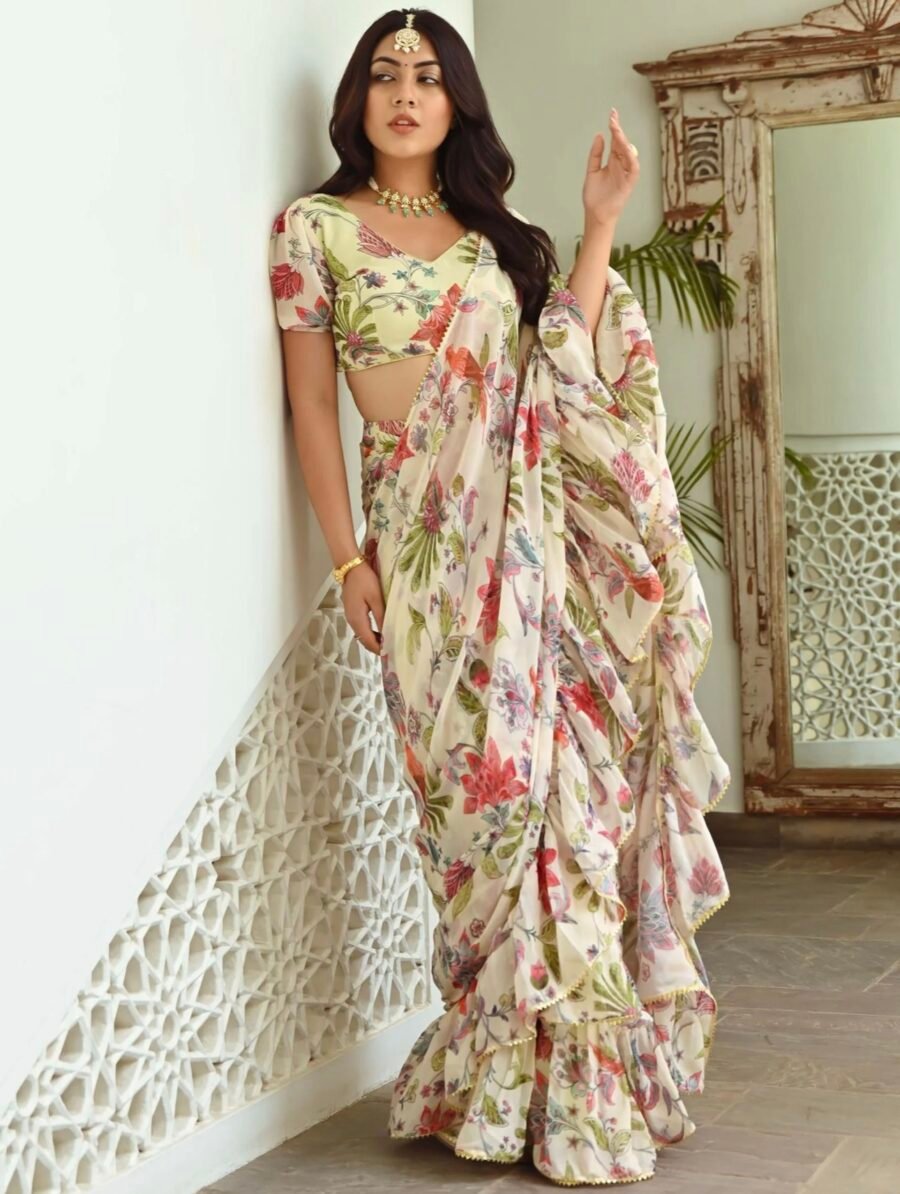 LIGHT GREEN PRINTED RUFFLE SAREE