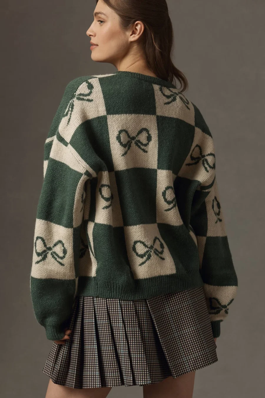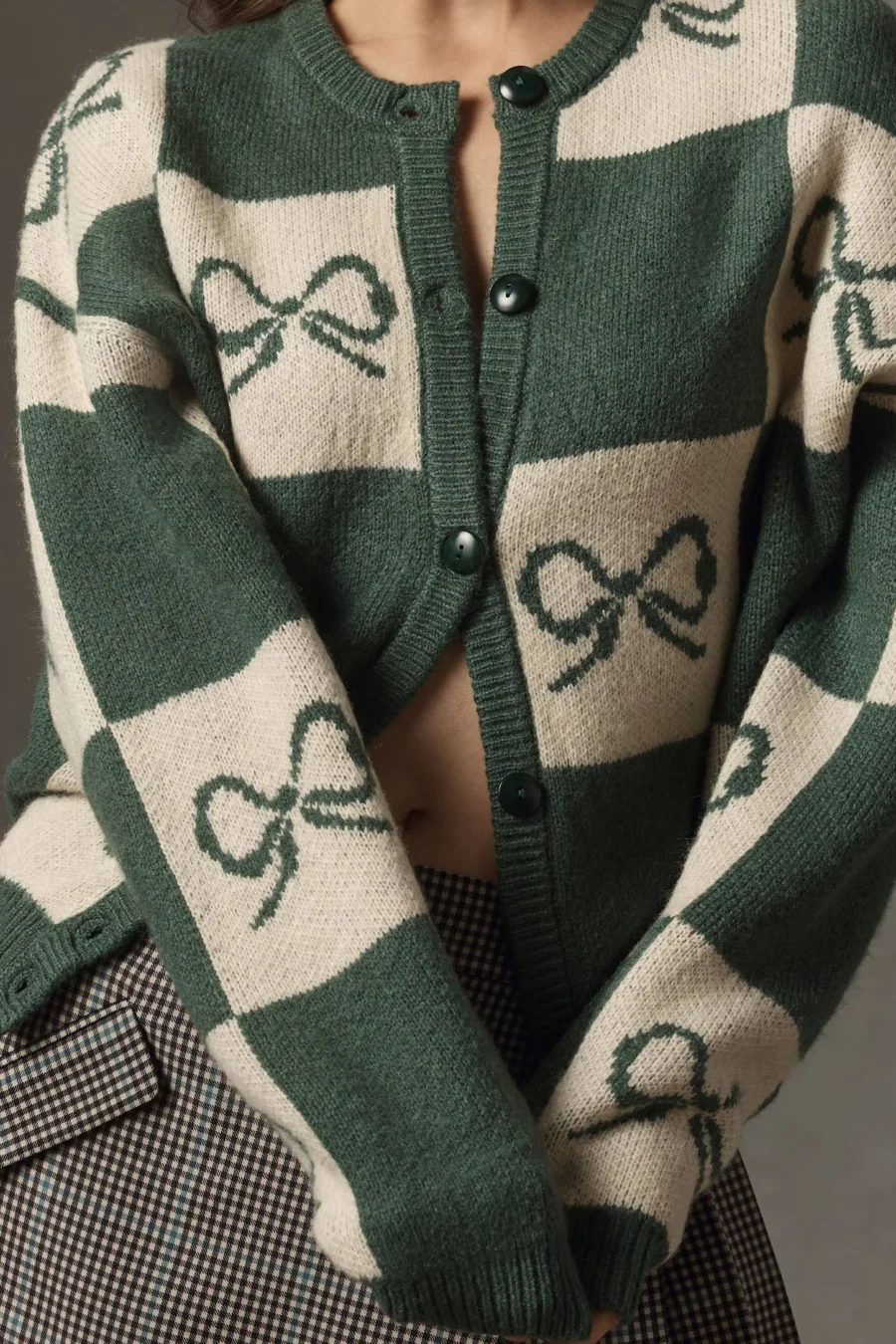 LISA SAYS GAH BOW CHECK CARDIGAN SWEATER