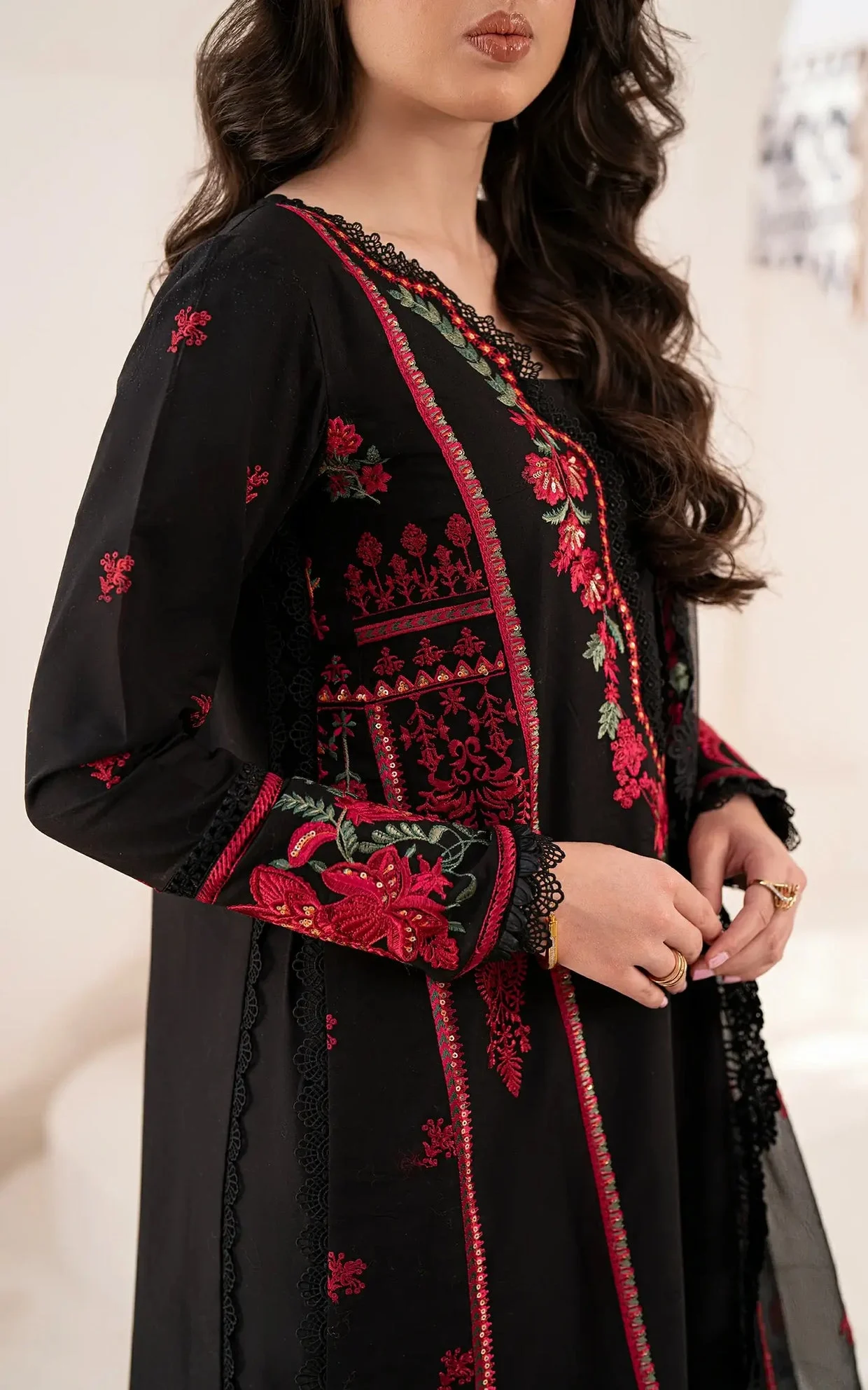 Embroidered dupatta on khaddi net.