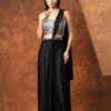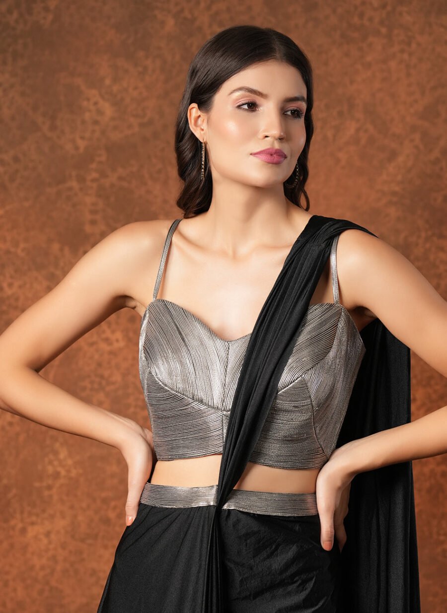 This chic fusion draped saree features a metallic finish silver dori-work bustier with noodle straps paired with a black satin pre-draped saree