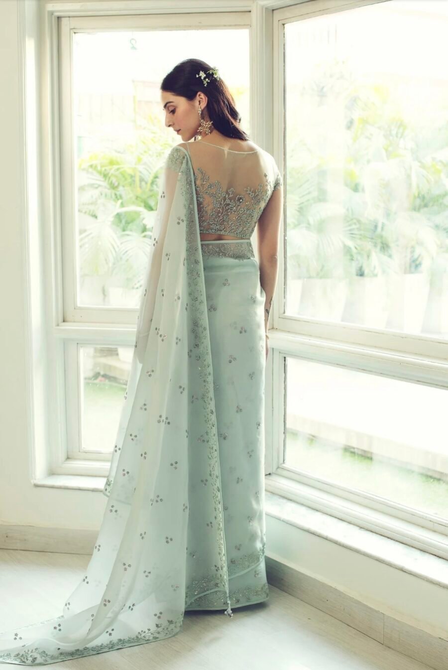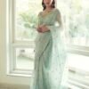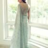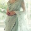 PISTA GREEN SILK ORGANZA SAREE WITH EMBELLISHED BACK BLOUSE