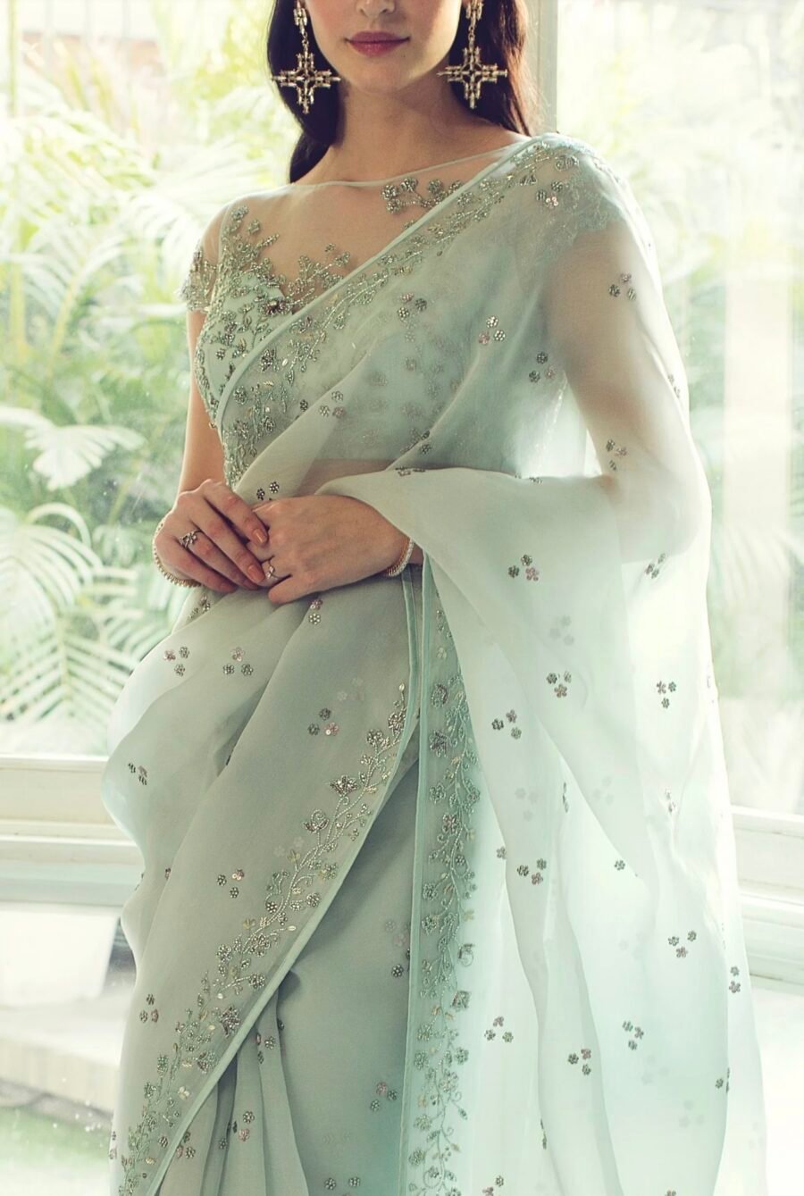 One glimpse is never enough with this delicate silk organza satin saree. The beautiful floral design katdana, sequin and swarovski embellished blouse has a sheer back hand embellished blouse in a floral design, having a sheer back and delicate cutwork detail. The silk organza fine embroidery make the outfit perfect for weddings, bridesmaids and other events.