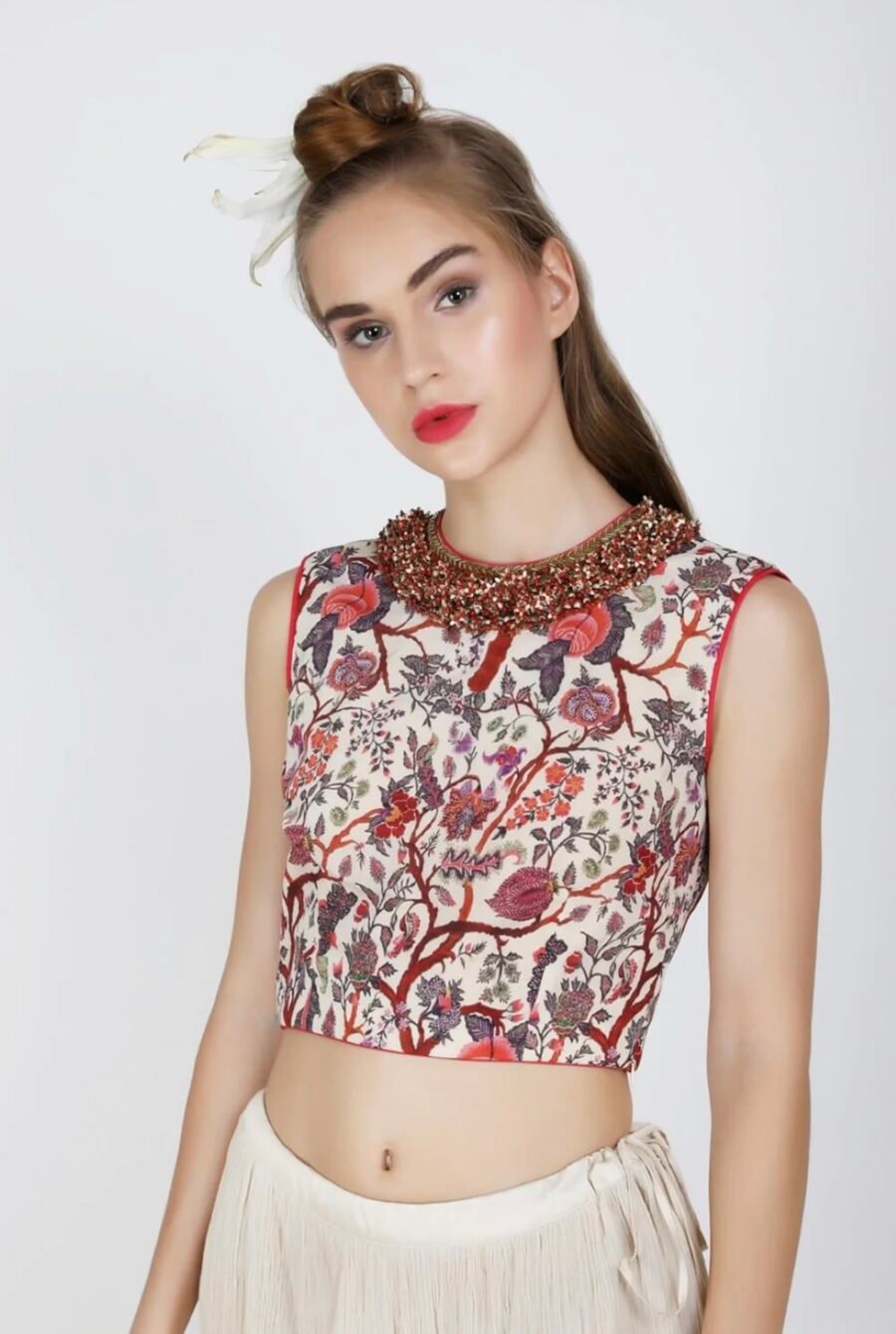 Lilly grey jaal printed embellished silk blouse with printed georgette saree.