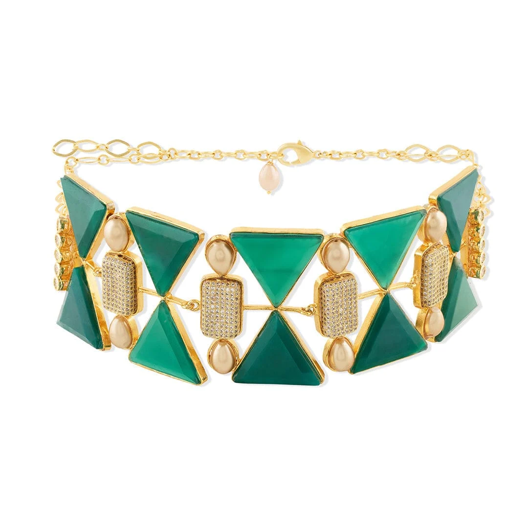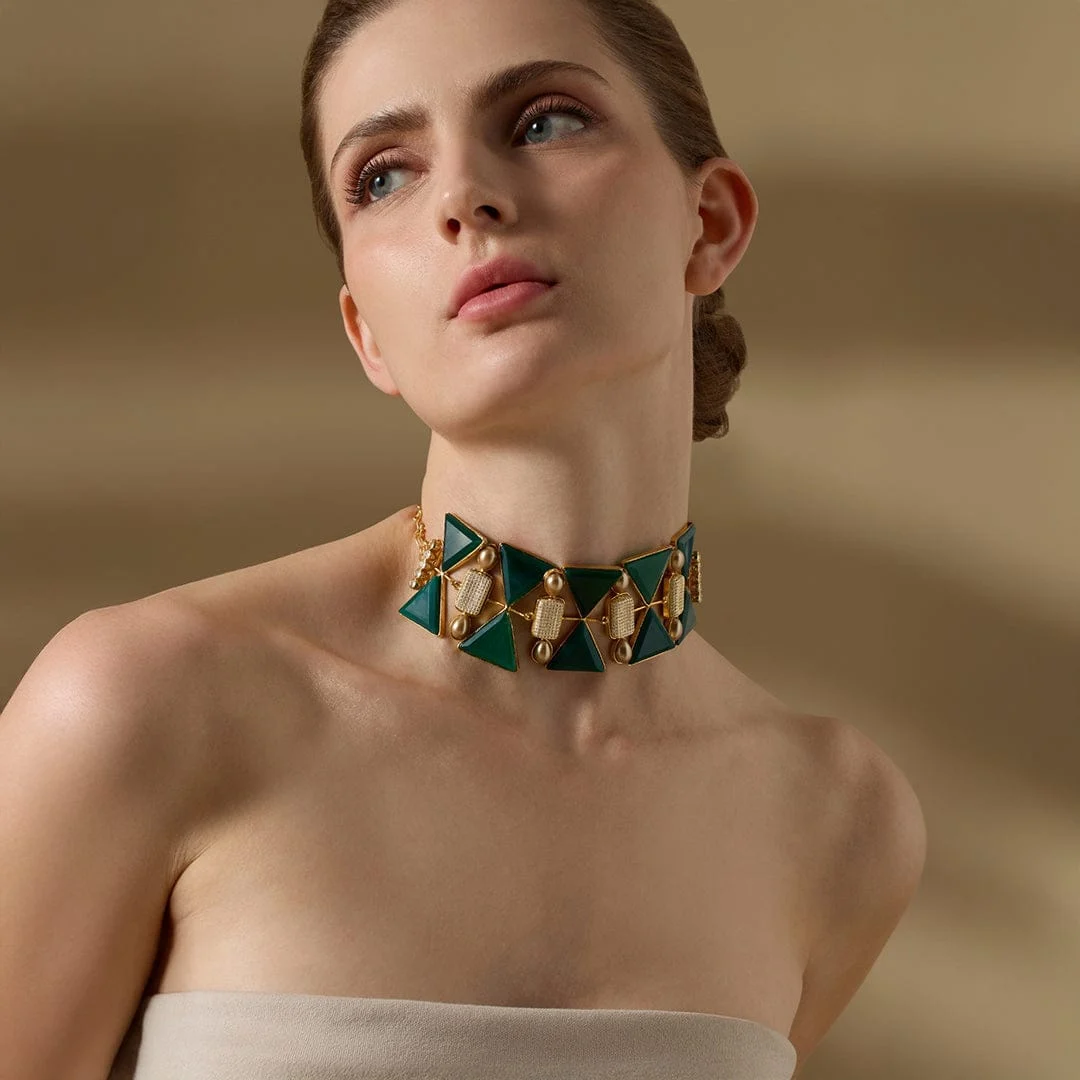 The Sylvaine Choker is rooted in the strength and stillness of nature. Carved green agate segments rest in a rhythm of gold, creating a refined geometry that frames the neckline. Secured with a lobster clasp, its earthy yet elevated. Natural variations in the agate lend each piece an effortless sense of individuality.