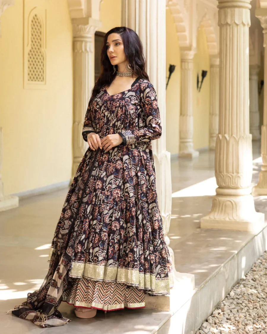 Let yourself loose in this ultra glamorous and super comfortable Vaniki Handblock Tier Sharara Set. A true amalgam of modern style and traditional hand block print, this sharara set will keep all eyes on you.