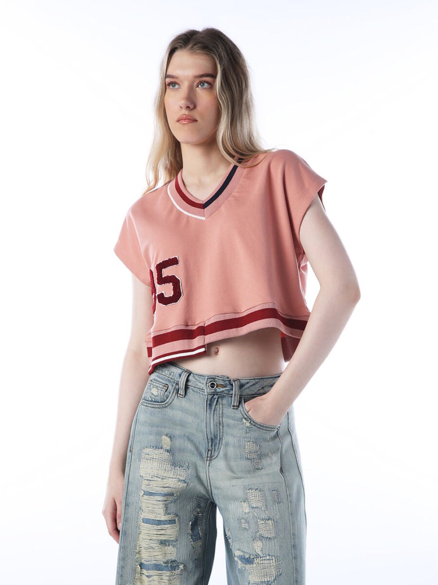 Meet your new go-to for chill days: the varsity styled cropped sweatshirt! Sleeveless, super comfy, and cut in a loose fit, it’s got a playful vibe with applique details and a V-rib neckline. Effortless style, zero fuss.