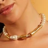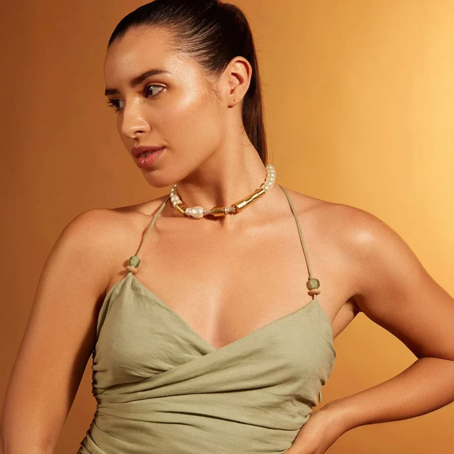 White Pearl Line Choker – Elevate your style with a single-line pearl choker, accentuated with gold chunklets for classic charm with contemporary allure. Versatile for denim shirts, maxi dresses, traditional tunics, cocktails, and evening gowns. Micron Plating ensures enduring quality.