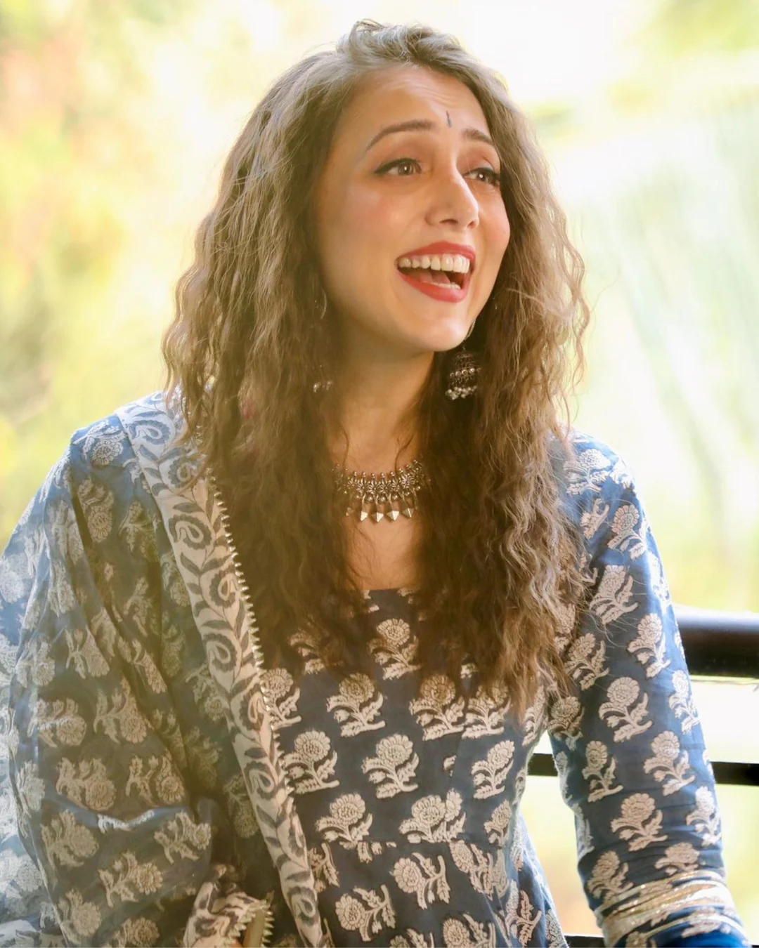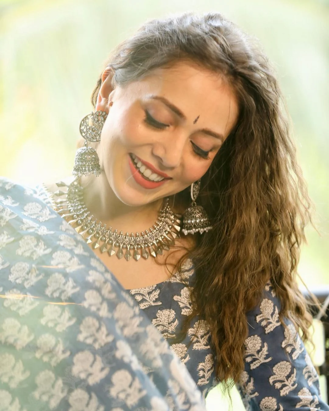 Blue handblock suit set paired with pant and dupatta. This set is adorned with handblock print all over it.
