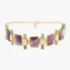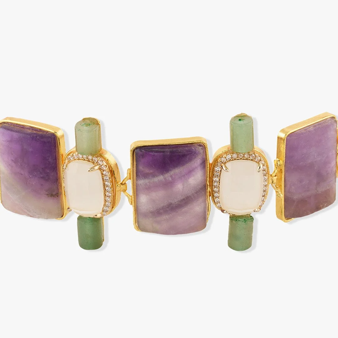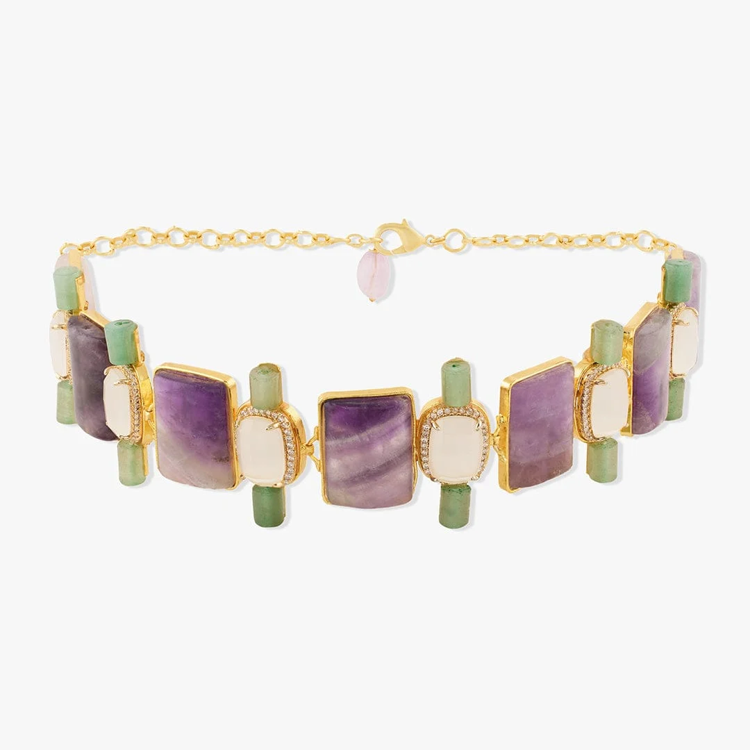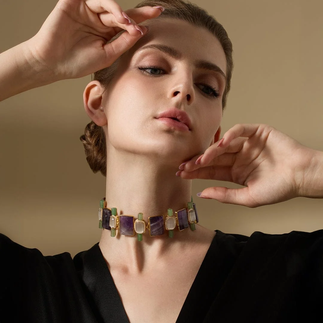 The Xelene Choker mirrors the calm glow of dusk across amethyst skies. It features richly colored purple agate stones set along a structured gold-toned band. Finished with a lobster clasp, it adds refined boldness with a celestial touch. The stones are naturally varied, giving each choker a quiet rhythm of shape and tone.
